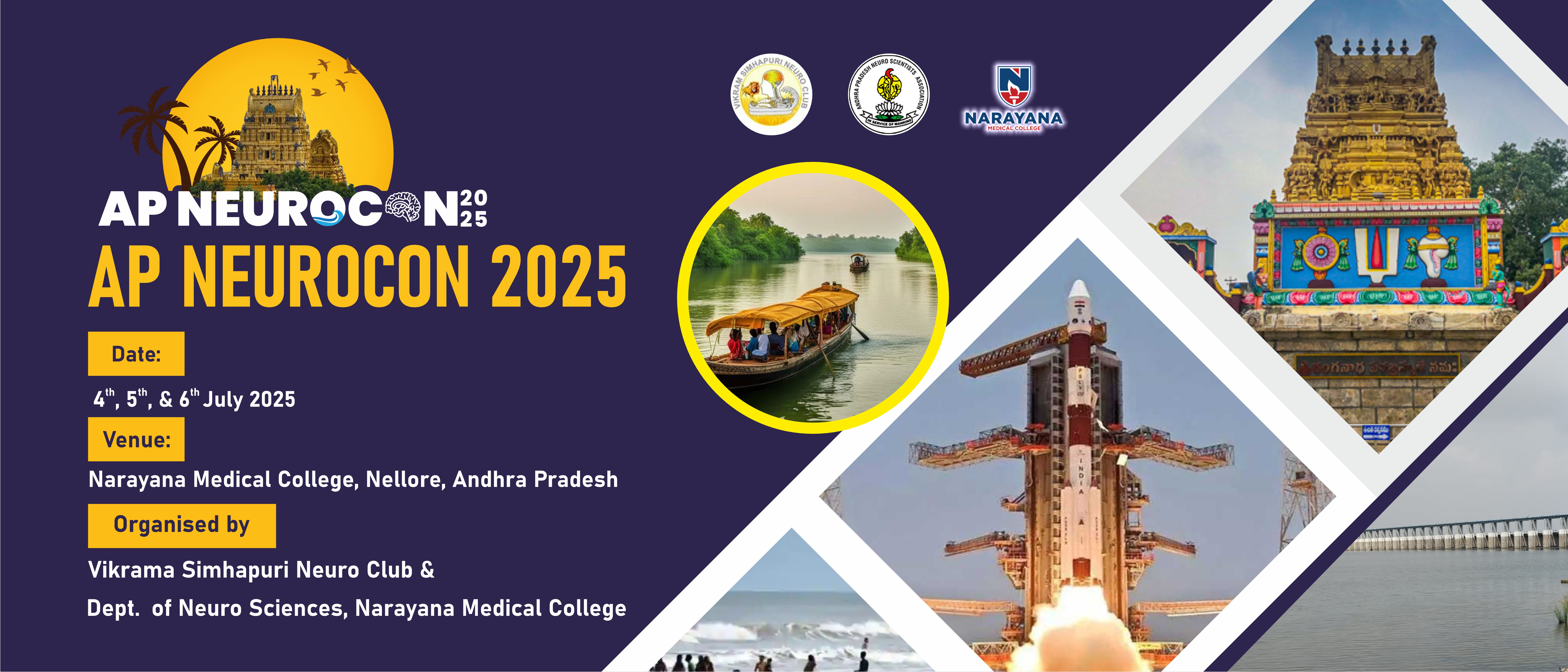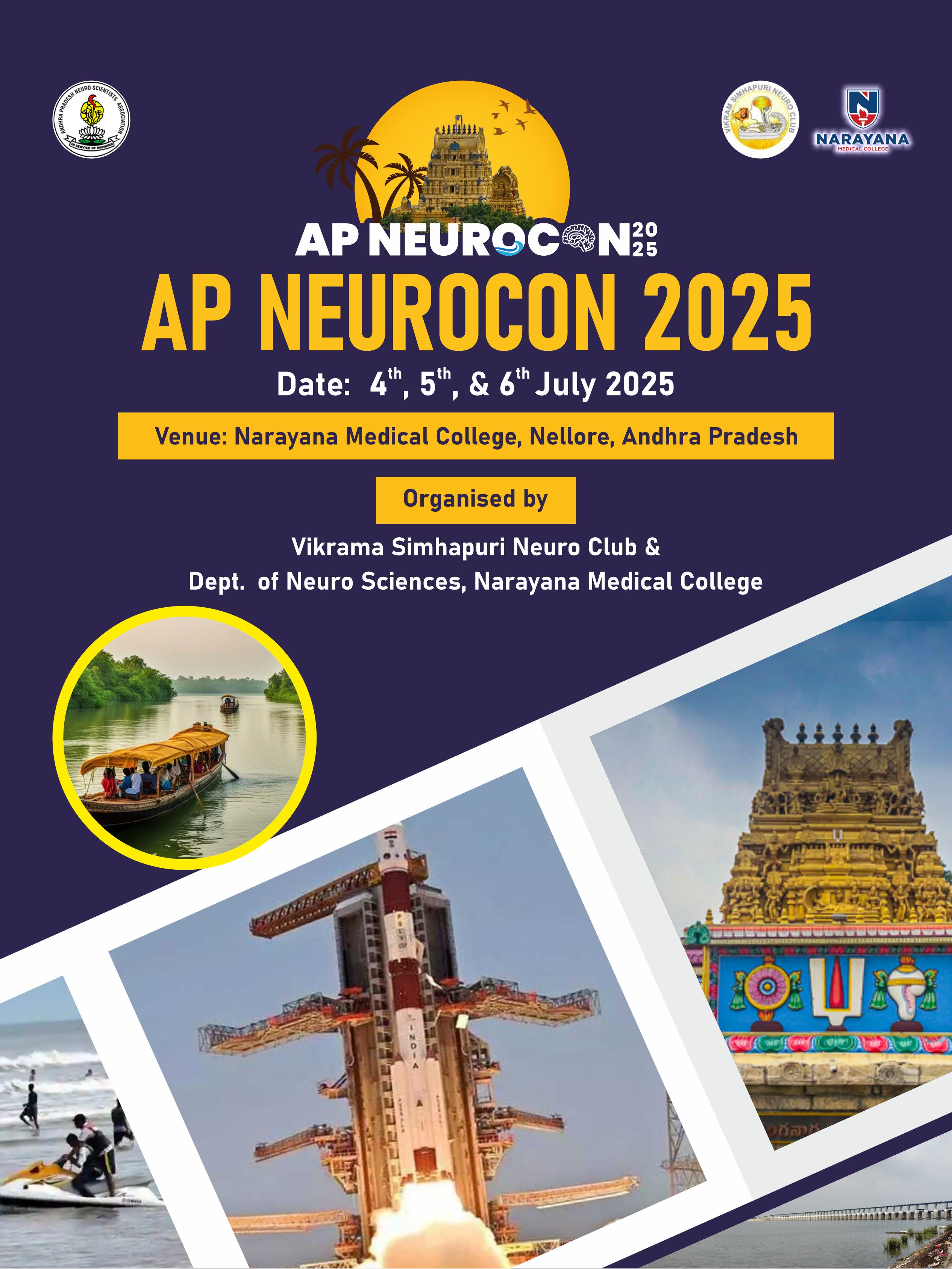 Greetings! We are thrilled to welcome you to AP NEUROCON 2025, a symphony of innovation and excellence in neurological sciences. Join us in Nellore, Andhra Pradesh, from July 4-6, 2025, for an intellectually stimulating experience. Explore cutting-edge research, engage with renowned experts, and network with peers. Immerse yourself in Nellore's rich cultural heritage and breathtaking natural beauty. We look forward to sharing this unforgettable journey with you!